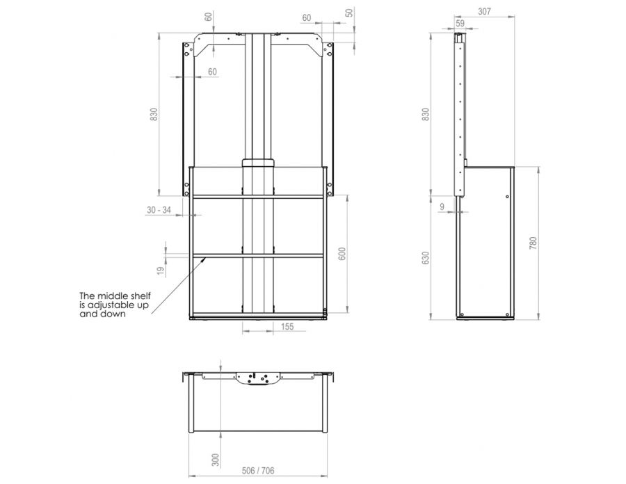 Past bij kasthoogte 850 mm of hoger, (bij hoger dan 850 mm wordt een vaste plank boven de lift geplaatst)